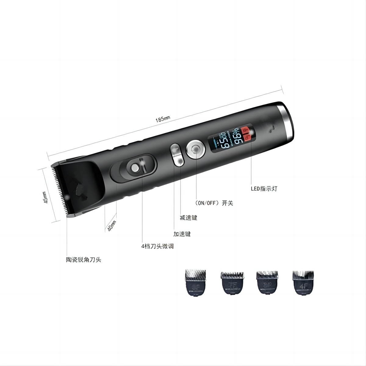 • హై-డెఫినిషన్ LED స్క్రీన్ బ్యాటరీ స్థాయిని నిజ-సమయంలో ప్రదర్శిస్తుంది, వస్త్రధారణ సమయంలో విద్యుత్ అంతరాయాలను నివారిస్తుంది మరియు ఇంటి వస్త్రధారణ లేదా సెలూన్ సేవలను సున్నితంగా చేస్తుంది.