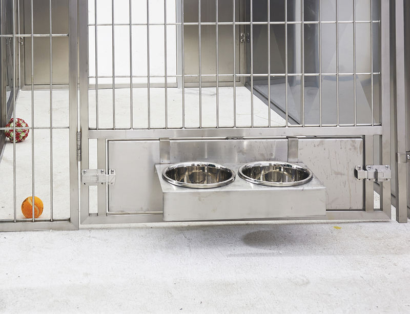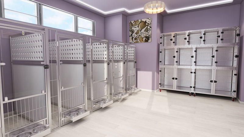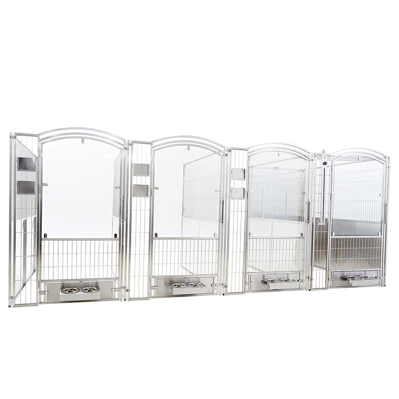 మల్టీ-పర్పస్ యానిమల్ బోర్డింగ్ మరియు క్వారంటైన్ కేజ్ జంతు గీతలను పూర్తిగా నివారిస్తూ అనూహ్యంగా సుదీర్ఘ సేవా జీవితాన్ని నిర్ధారించడానికి బలమైన, భద్రత-స్వభావం గల గాజును ఉపయోగిస్తుంది. పూర్తిగా వెల్డెడ్ కేజ్ బాడీ సులభంగా శుభ్రపరచడానికి మరియు పరిశుభ్రతను నిర్వహించడానికి గుండ్రని మూలలను కలిగి ఉంటుంది. కేజ్ యూనిట్లను ప్రస్తుతం ఉన్న కిటికీల ముందు నేరుగా ఉంచవచ్చు, వాటిని కుక్కపిల్లల విక్రయాలు మరియు దత్తత ప్రాంతాలకు ప్రత్యేకంగా సరిపోయేలా చేస్తుంది.